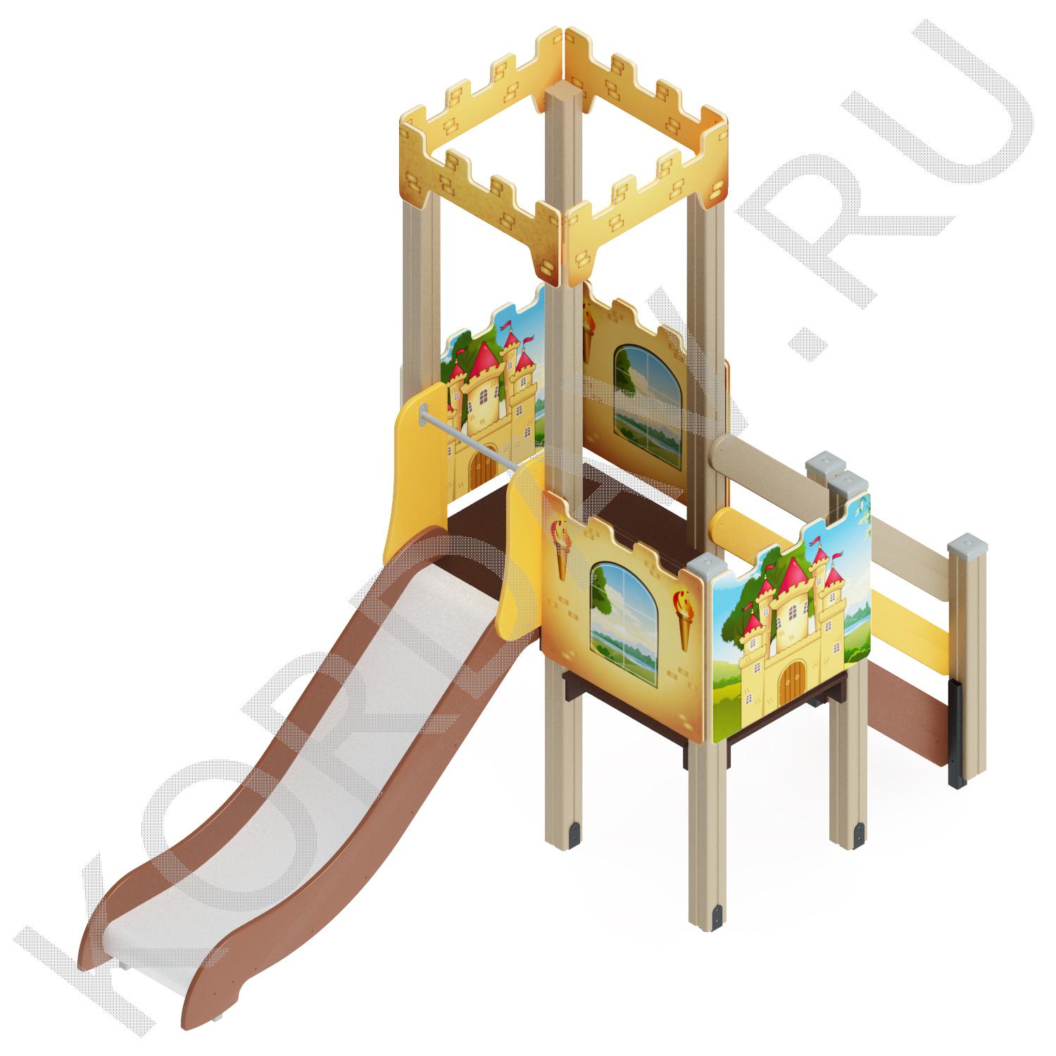 Детский спортивно-игровой комплекс включает в себя горку-башенку и лестницу. Комплекс очень компактный может разместиться даже на не большом участке.